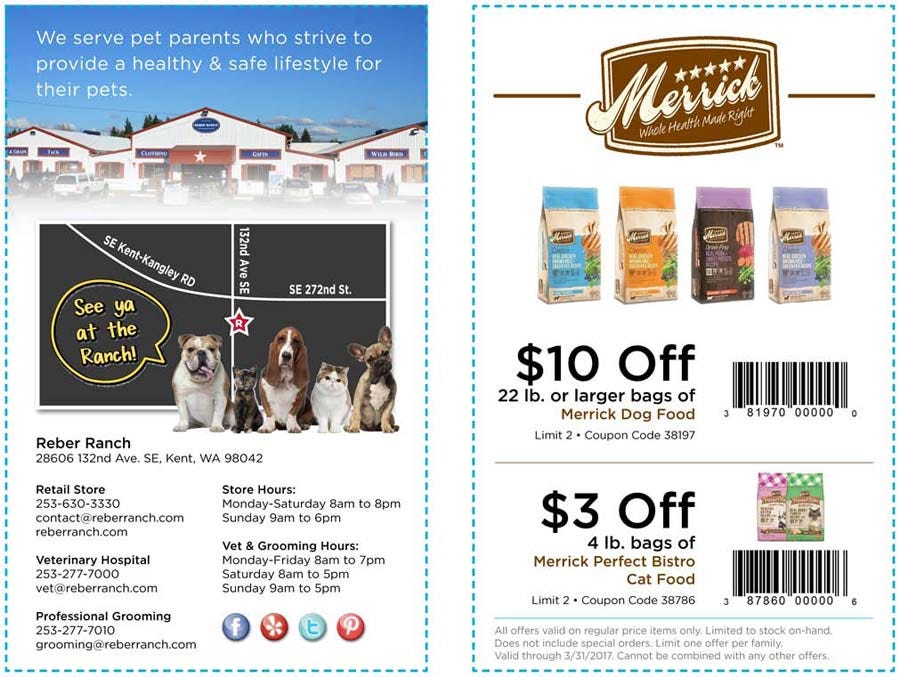 Tow dog food coupons for Merrick dog treats. In-Store Pickup Delivery Ship. 30 off 7 days ago As an online pet store Merrick Pet Care was launched to the public in 1988 and Merrick Pet Care products mainly cover dog and cat food as well as various pet snacks.